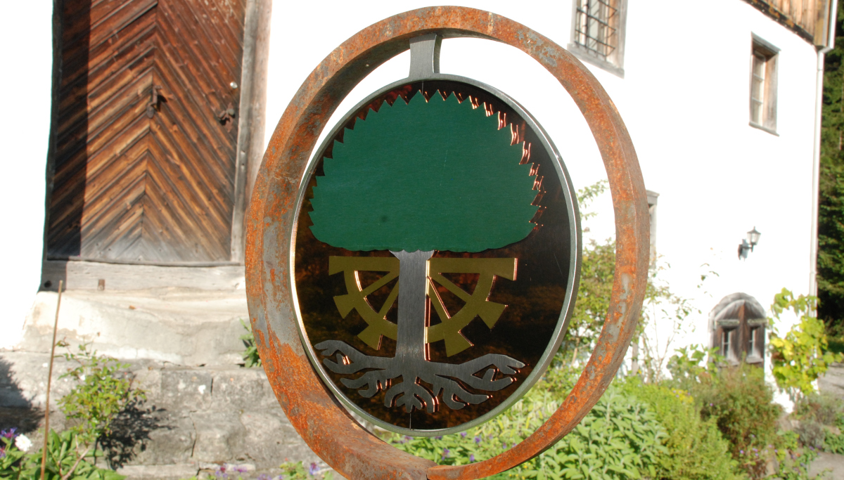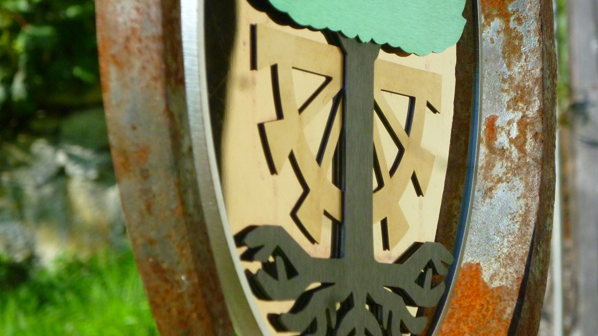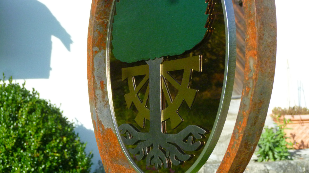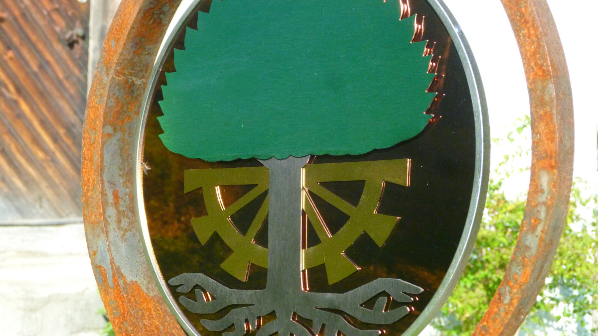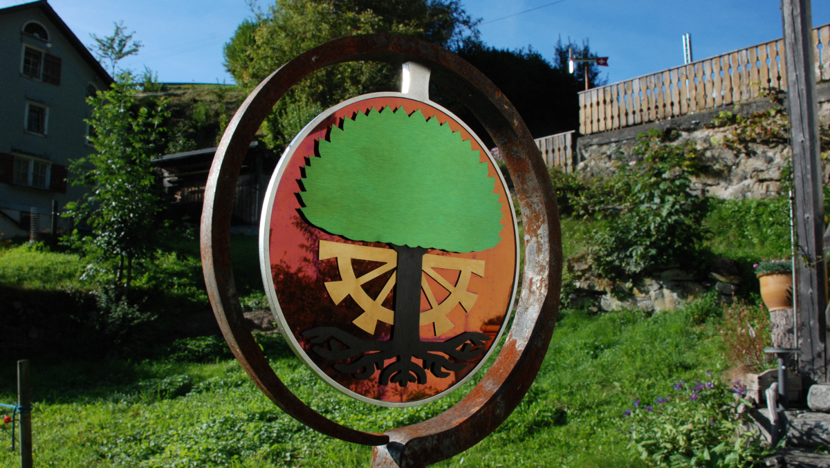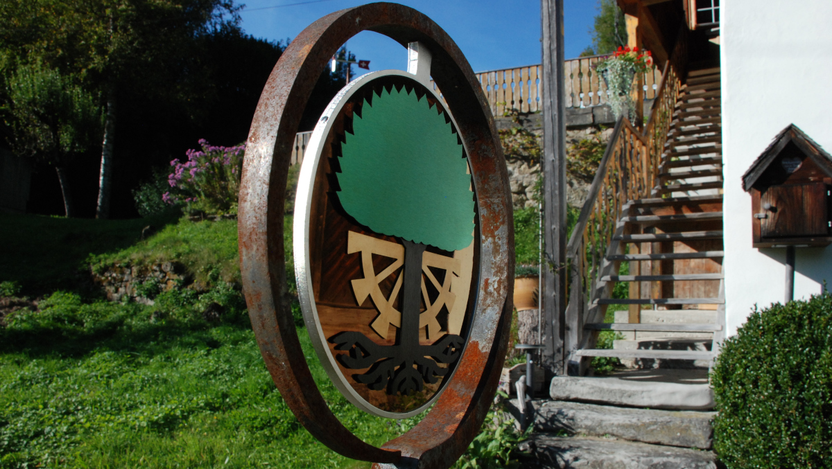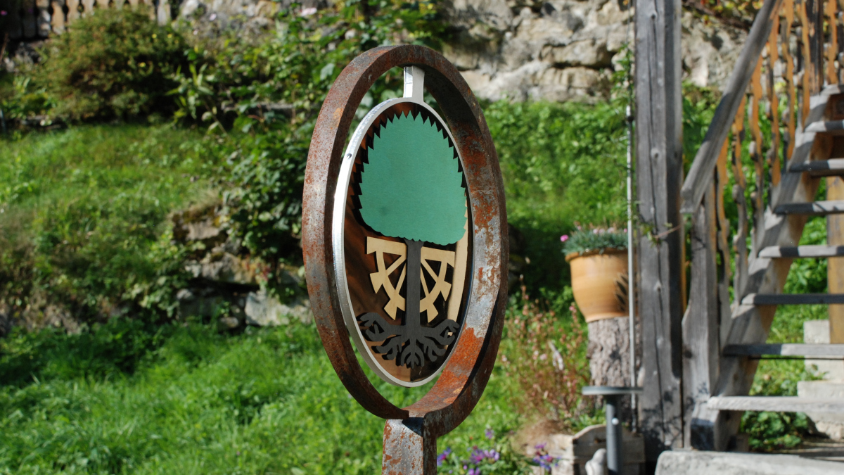 Das Ringeisen, liebevoll geschmiedet, steht schon eine Weile an dem idyllischen Ort im Toggenburg. Aber etwas fehlte noch. Die Schmidin hat noch eine Menge weitere Projekte. Eine Bekannte verwies daher die Besitzer des Idylls an mich. Ich hätte sicher eine Idee. Wir haben überlegt, was passen könnte. Farbig sollte es schon sein. Metall wäre auch nicht schlecht. Nicht nur wegen dem Verwittern. Ein paar Wochen zuvor entdeckte ich farbiges Edelstahlblech. Also statt geschmiedet - gelasert. Nach einigen Entwürfen und Erwägungen war klar, dass es dieses Blech sein soll. Einmal mehr Neuland - irgenwie ziehe ich das an :-). Schmiedeisen und Edelstahl? Warum auch nicht? Dank guten Lieferanten, Geduld und dem ein oder anderen Einfall ist es gelungen. Das Namenswappen macht sich wirklich gut und spielt wunderschön im Licht.